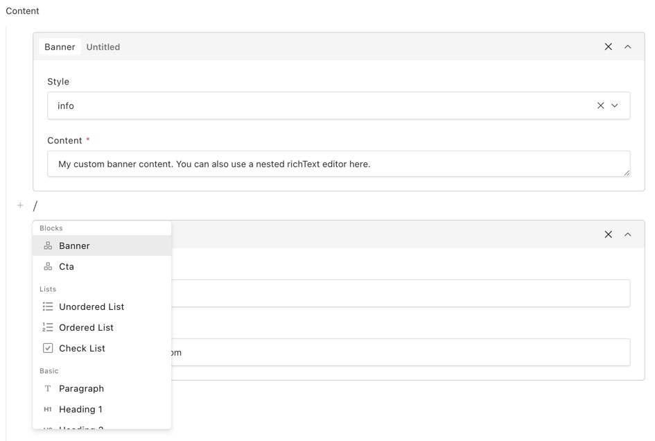 The BlocksFeature allows you to embed Payload's Blocks Field directly inside your Lexical rich text editor. This provides a powerful way to create structured, reusable content components within your rich text content.