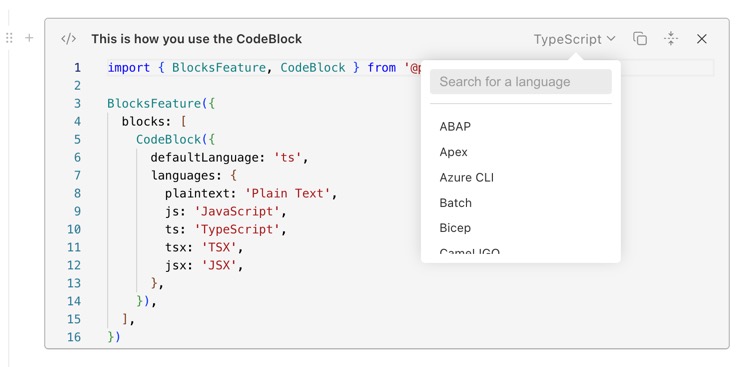Payload provides a pre-built CodeBlock that you can use directly in your projects. It includes syntax highlighting, language selection, and optional TypeScript type definitions support: